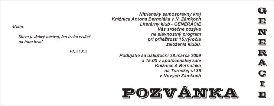 Pozvánka do Knižnice Antona Bernoláka v Nových Zámkoch na stretnutie pri príležitosti 15. výročia založenia literárneho klubu Generácie, 28. 3.