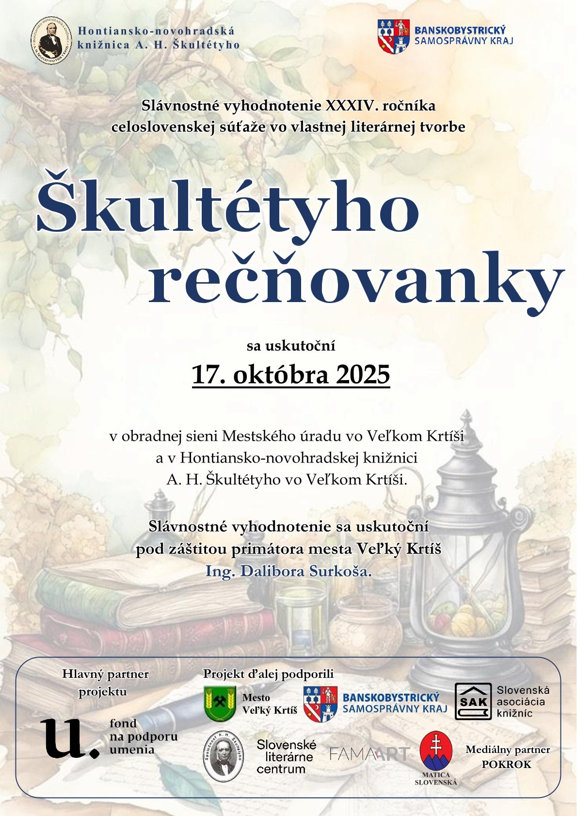Hontiansko-novohradská knižnica A. H. Škultétyho vo Veľkom Krtíši Vás srdečne pozýva na slávnostné vyhodnotenie 34. ročníka celoslovenskej súťaže vo vlastnej literárnej tvorbe žiakov ZŠ a študentov SŠ „Škultétyho rečňovanky“.